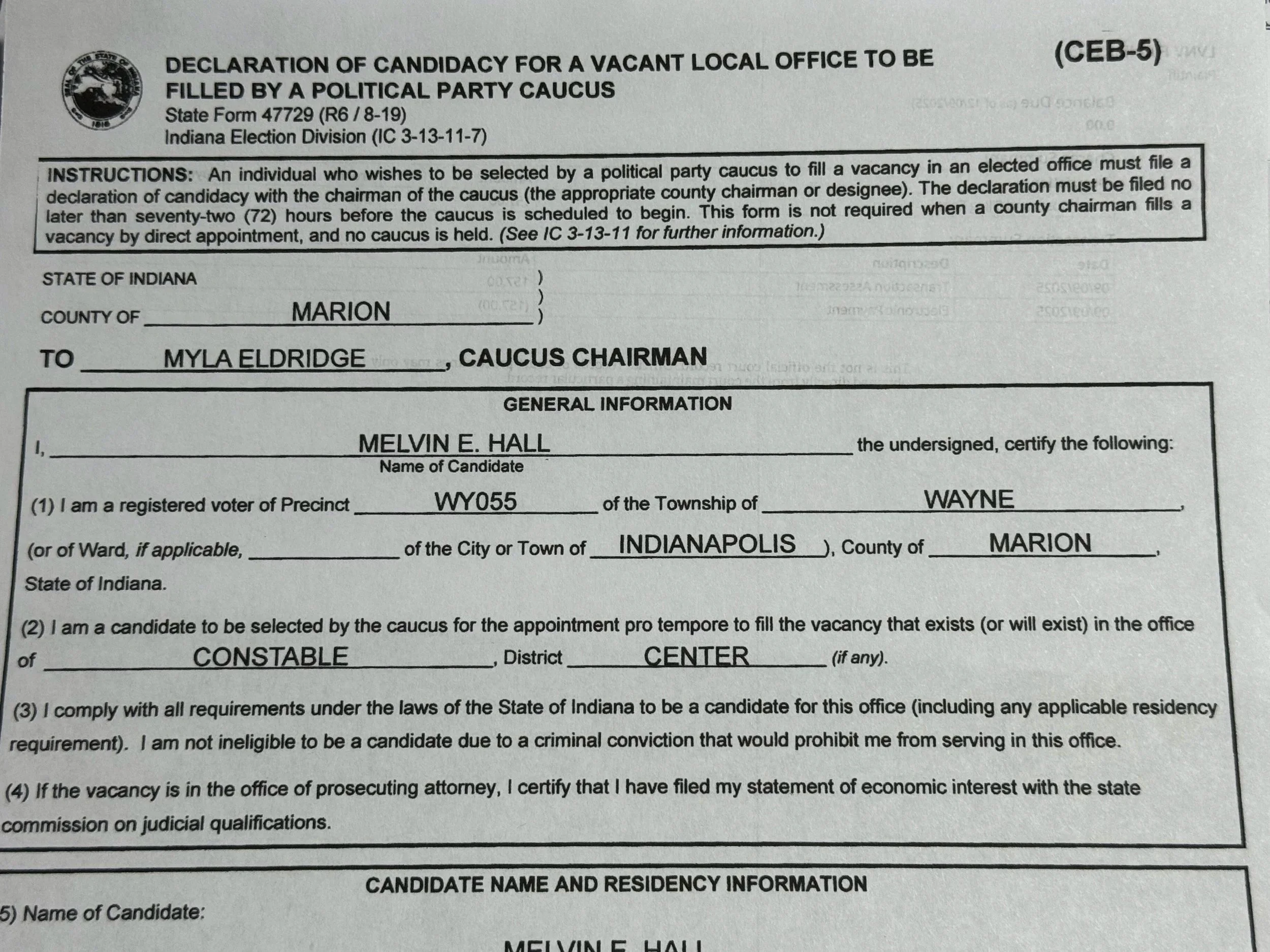 This email is to acknowledge receipt of your intent to run in the caucus to fill the vacancy in the Office of Center Township Constable. Please see the link below for the PC List as well as the attached CEB-5 form which needs to be filed with Marion County Democratic Party Chair Eldridge no later than 72hrs before the caucus. The caucus will be located at the Julia Carson Govt Center on Friday November 8th @ 5pm.